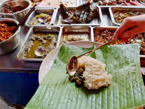 你還在糾結(jié)中午吃啥?大魚大肉吃膩了,來份糯米飯如何?西雙版納的糯米飯與其他地方的有所不同,光是配料就有十幾種,而且每個店家都有自己的搭配創(chuàng)意。除了必不可少的幾種咸菜外,其余的配菜可謂是豐富多樣,將糯米飯放到芭蕉葉上,加上具有傣族風(fēng)味的涼拌雞絲,一份厚實的烤豬干巴,一塊分量十足的午餐肉,酸辣開胃的豇豆和小米辣酸筍,會吃的還可加一份螃蟹醬,一頓豪華版糯米飯作為午飯,真是又開胃,又頂飽,不一樣的特配更是讓人念念不忘。
