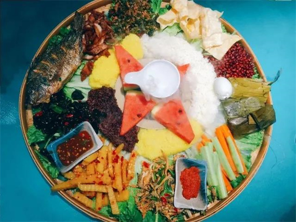 大筲箕上鋪上一層芭蕉葉,將傣族美食集合葷素搭配,加上食材染出的彩色糯米飯和水果,擺出各種精美的造型,用手抓著品嘗,整頓飯都吃得十分獨特。古樸美味的味蕾盛宴擺脫了傳統(tǒng)餐食的繁文縟節(jié),用原始樸實的方式呈現(xiàn)在人們面前,頃刻間便能感受到突破桎梏的愉悅,與美味食材親密接觸,回歸質(zhì)樸醇厚的飲食文化之中。