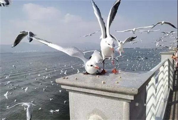 紅嘴鷗盤旋在低空,來銜游客拋在空中的面包,密密麻麻的,頗有遮天蔽日的勢頭。
