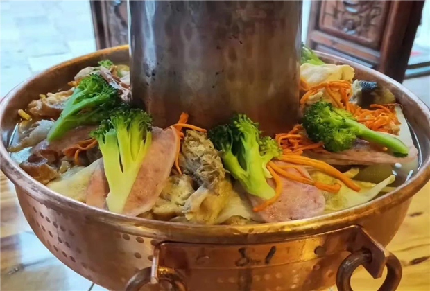 烹飪時,在鍋內(nèi)底部先鋪上一層蔬菜、粉絲、山藥等素菜,上層再將制作好的酥肉、丸子、豆腐等食材放好,擺上現(xiàn)切的火腿片、鮮肉片等,加入燉好的高湯,點燃木炭,待食材吸收了炭火的溫度,浸泡著湯汁的食材味道相互融合,便可享用湯鮮肉美的炊鍋了。