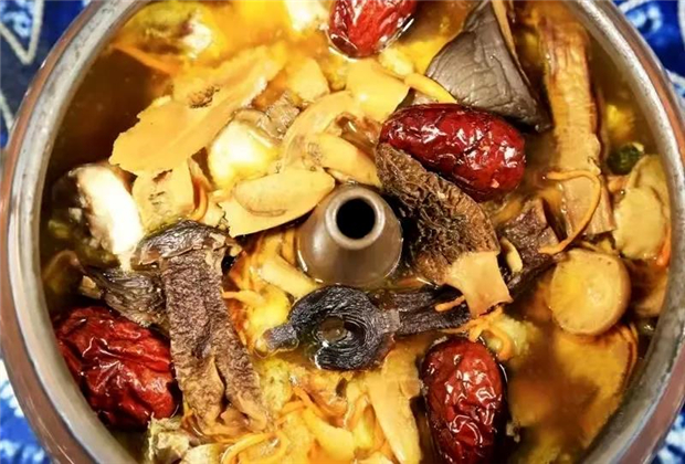 汽鍋是一種以陶為原料制作的鍋,它最妙就在于——以別致的結(jié)構(gòu),把“蒸”、“燉”這兩種傳統(tǒng)的烹飪方式巧妙地融合,發(fā)揮炊具最大的聚能效果,使得雞肉雞湯能夠被放大、最終呈現(xiàn)“本味”的特色。用極少的調(diào)味料,烹出“鮮”的味道,絕對是大多數(shù)人對汽鍋雞的第一印象。雞湯雖表面略帶油花,但喝起來卻不膩反而鮮美可口,在這寒風(fēng)瑟骨的冬天,來上一碗滋補暖胃是再好不過的了。