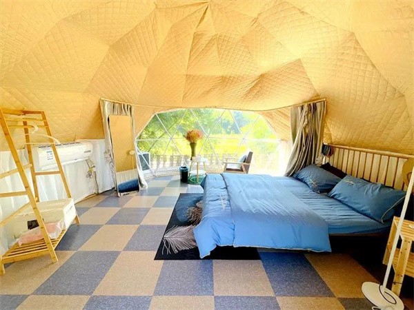 露營(yíng)基地共建有6個(gè)大帳篷,每個(gè)帳篷占地約56㎡,帳篷里配有空調(diào)、超軟大床、茶幾沙發(fā)、干濕分離淋浴房、衛(wèi)生間、洗漱間等,帳篷前方還有高大落地窗,山野美景盡收眼底,最具特色的星空屋頂,躺在床上便可仰望璀璨星空。