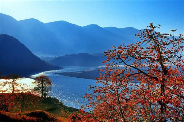 火紅的樹葉、枯黃的茅草、清淺的江水