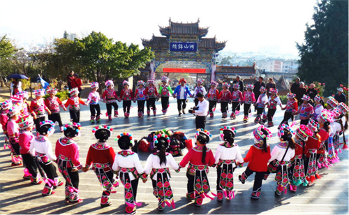 在彝族民歌中,兒歌極為豐富。在過去孩子沒有條件上學(xué)的年代,這些兒歌就成為孩子們傳授簡單的生活、生產(chǎn)知識的教科書。內(nèi)容帶有一定的故事情節(jié),語言生動風(fēng)趣,曲調(diào)活潑簡練。演唱時常成群結(jié)隊(duì)地進(jìn)行,手牽著手,左搖右晃,十分天真自得。
