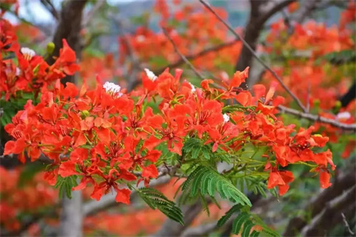 夏風颯颯,鳳凰花亦隨之搖曳,像飽飲了玫瑰酒似的,泛著紅暈,分外妖嬈,一絲絲淡淡的清香縈繞鼻尖。高大的樹干自然舒展,灑脫自如,花朵相互簇擁著,像一團團燃燒的火焰,又像天空中散落的云霞。一朵朵、一團團、一簇簇的鳳凰花便仰臥在樹梢,火紅一片、絢麗奪目,驚艷了夏日的時光。移步樹下抬頭仰望,藍的天、白的云、紅的花、綠的葉,分明是一幅色彩明艷、富麗堂皇的美麗畫卷。比起商業景點的風光,綠汁鎮是那么地低調,默默承載著當地人的依依鄉愁,也深知腳下土地的悠悠過往。