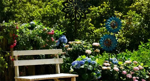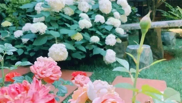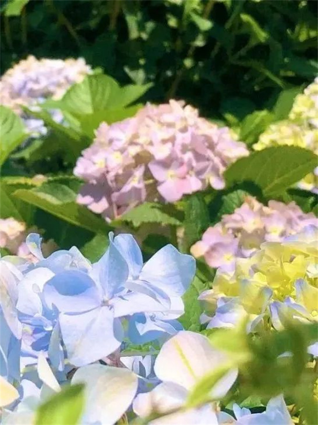 陽光斜照在樹葉上,投下的影子為繡球花打了一把傘。層層疊疊的繡球花開在曲徑通幽的小路旁,引著人進入一個又一個多彩夢境。