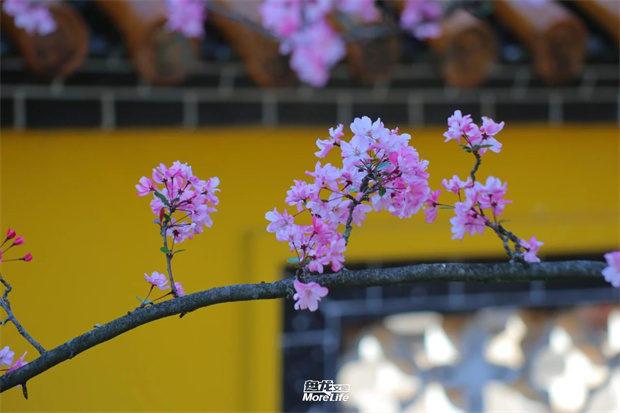 當梅香褪去最后一縷暗香,公園里的垂絲海棠正以漫天緋云的姿態(tài),在古建筑群中織就層層疊疊的春意。有的花枝疊影
