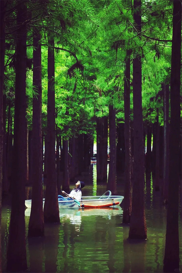 水杉林樹影婆娑、輕舟緩緩前行