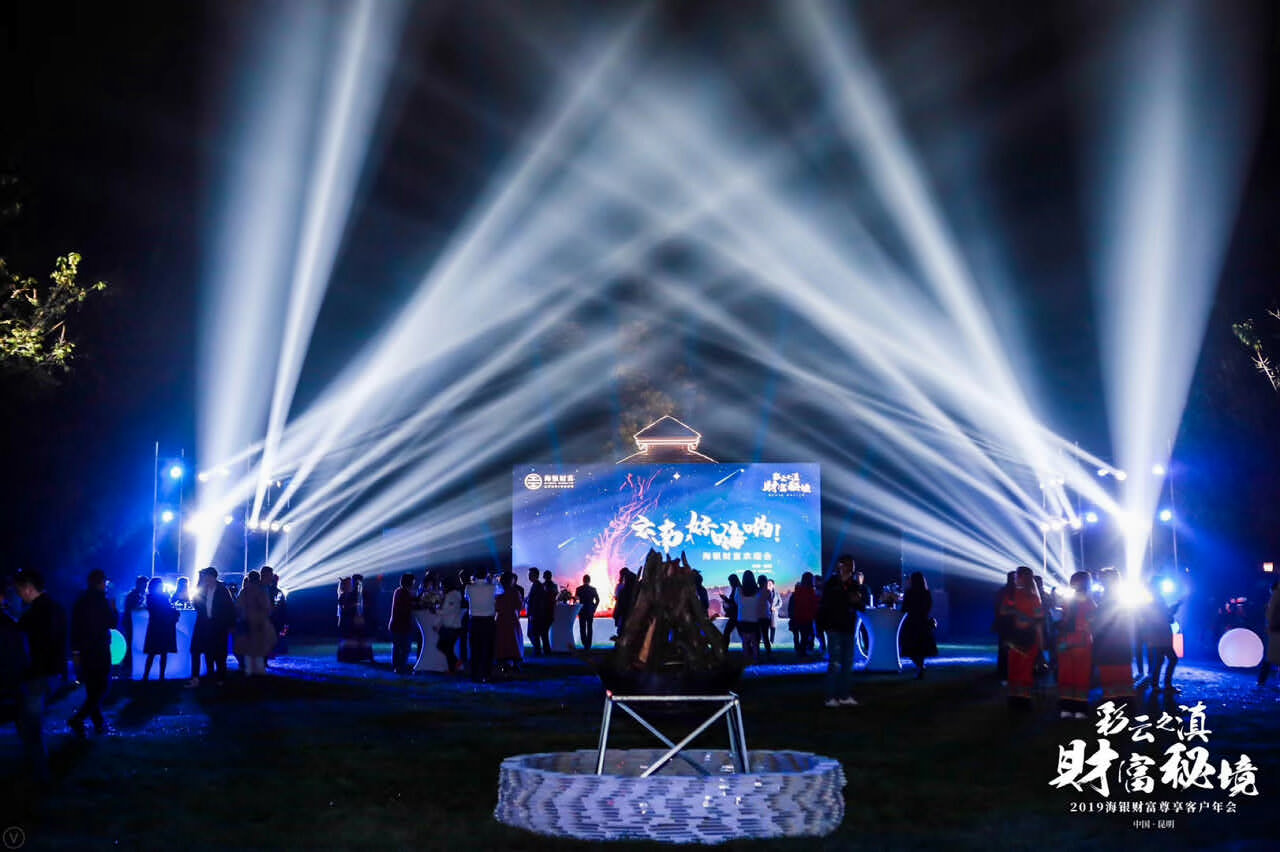 2019年海銀財富尊享客戶年會及答謝晚宴在滇池湖畔春城昆明召開;天行提供會議會展、獎勵旅游、市場活動管理及包括AV搭建、物料制作、活動場地、演藝、拓展、勞務人員等專項資源管理在內的專業會展服務。