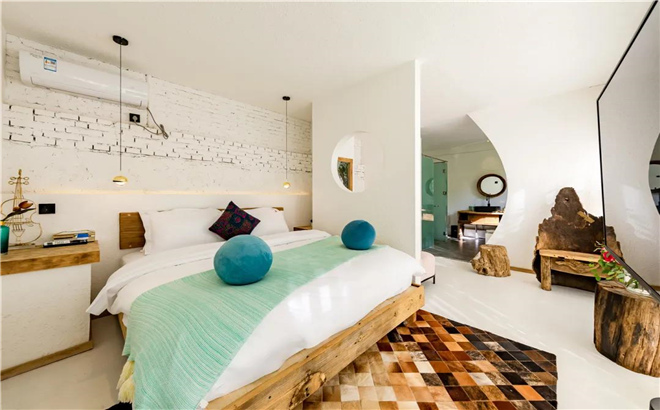 花園民宿房型分為白鳥、眠空 、天舞、藍山四種,每個臥室都配備超有藝術感的落地窗和大浴缸,隨手一拍都美美噠,房間內做舊的桌子打造了一種年代感與時尚激烈碰撞~