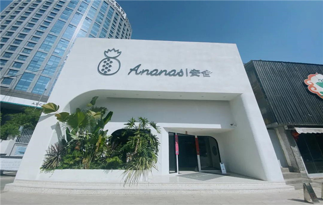 ANANAS安舍酒店在穿金路上,臨街白色建筑很顯眼,綠植很多。酒店的Logo“一個碩大的菠蘿”形象,和酒店所處位置“菠蘿村”密不可分。