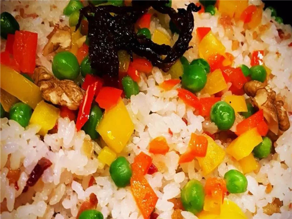 官渡古鎮的小吃店里,火腿洋芋燜飯是比較常見的,而且味道非常好,以銅鍋或砂鍋盛滿包含大米、火腿、蠶豆、土豆等色彩鮮艷的米飯,佐上一點當地的咸菜和湯,令再怎么挑剔的舌尖也難以抵擋住那色香味俱全的火腿洋芋燜飯。
