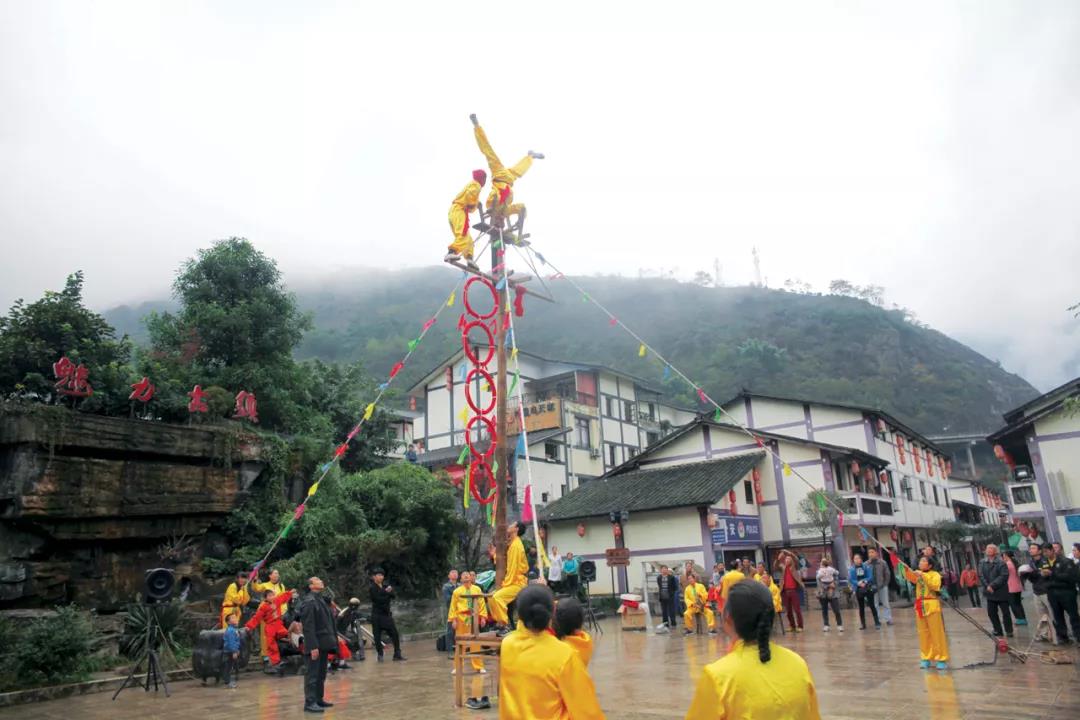 “鉆圈難就難在表演者需要連下5圈,最后雙手懸空倒掛在最后一圈,時間在1、2秒內,動作還要精準流暢。”竹竿頂端表演者垂直距離地面足有兩層樓高,可謂驚險刺激,觀者無不屏息凝神,拭目以待,高竿舞獅因此又被昭通作家譽為“針尖上的舞蹈”。