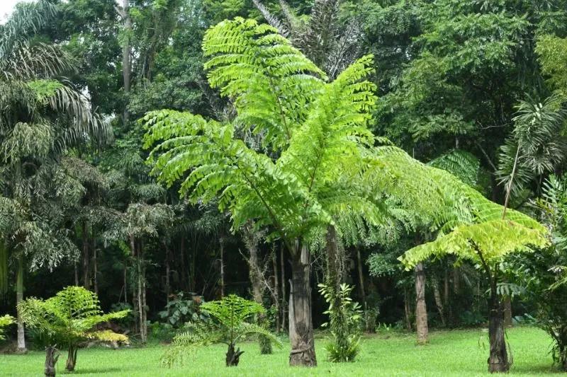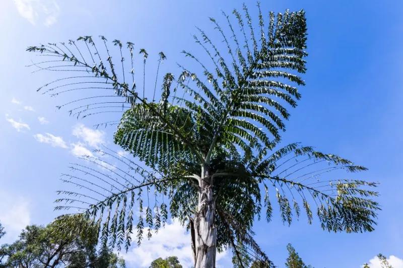 董棕也是熱帶雨林中的一員,生于石灰?guī)r山地區(qū)或溝谷林中,云南西雙版納東南部的熱帶溝谷雨林是它主要的分布區(qū)域之一。它高可達(dá)三十余米,即使熱帶樹(shù)木普遍高大,董棕也能“木秀于林”。葉片長(zhǎng)可至七八米,寬可至五米,比小巴車還要大。十余片葉片聚生于頂端,真如巨傘一般。