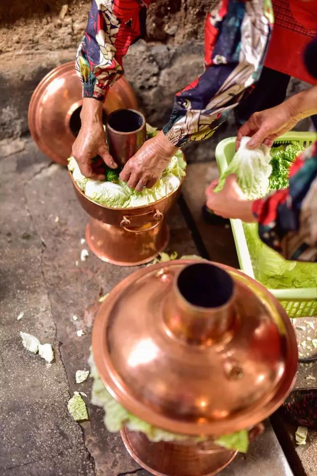 走進食府正房,左右兩邊各擺有餐桌,中央設有一茶桌、一方桌,方桌上陳列著一口銅鍋。煮通海炊鍋菜用的就是這樣的銅鍋。在古城中心街區,有多家店鋪售賣銅鍋,大大小小的各類銅鍋擺滿店面,最小的銅鍋夠四五人同時食用炊鍋菜,大的足夠十余人使用,有的銅鍋泛著锃亮的光,有的表面則附著一層黑色的“包漿”。