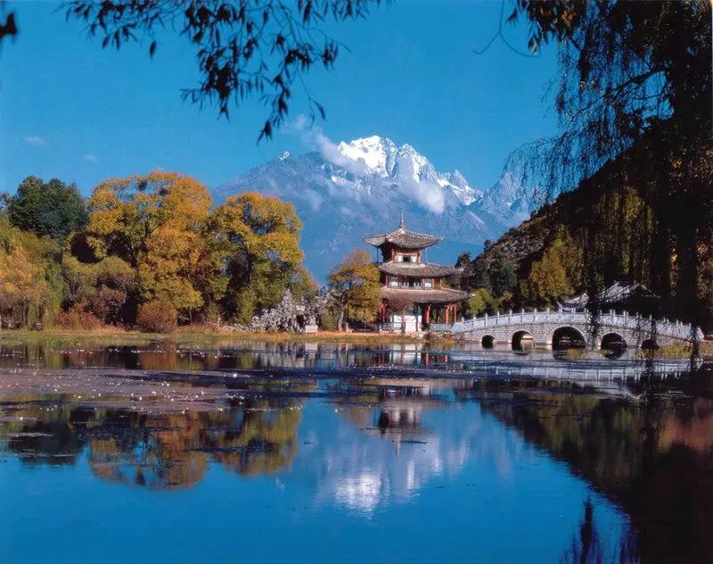 從麗江古城四方街沿經緯縱橫的玉河溯流而上,約行一公里有一處晶瑩清澈的泉潭,即為中外聞名的黑龍潭。