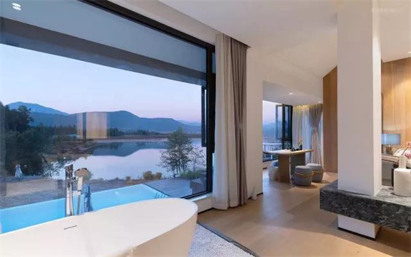 酒店里的124棟套房及別墅都面向玉龍雪山,在任何一個別墅內,玉龍雪山的美景都能盡收眼底。一邊欣賞令人神往的玉龍雪山全景,一邊在私人戶外恒溫按摩泳池里盡情放松,十分安逸。運氣好時,還可一觀日照金山。