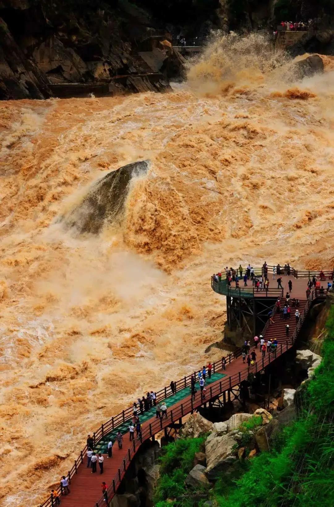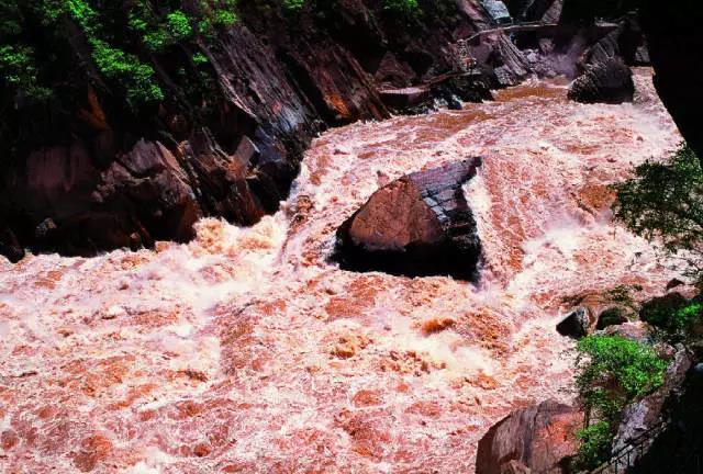 江流最窄處,僅約30余米,江心有一塊13米高的大石——虎跳石,巨石猶如孤峰突起,屹然獨尊,江流與巨石相互搏擊,山轟谷鳴,氣勢非凡。相傳猛虎下山,在江中的礁石上稍抬腳,便可騰空越過,故稱虎跳峽。